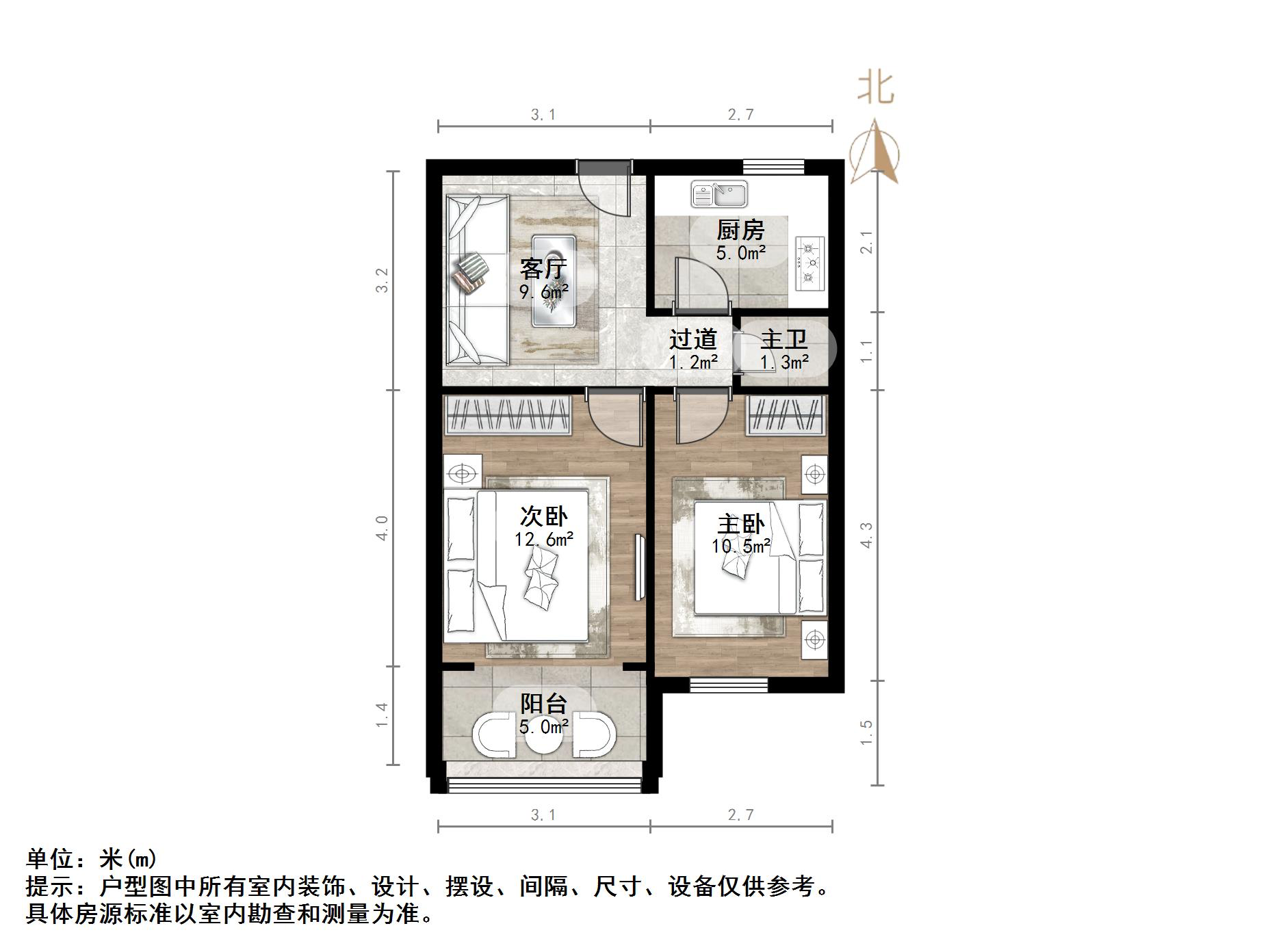 厅室2室1厅1卫1阳台